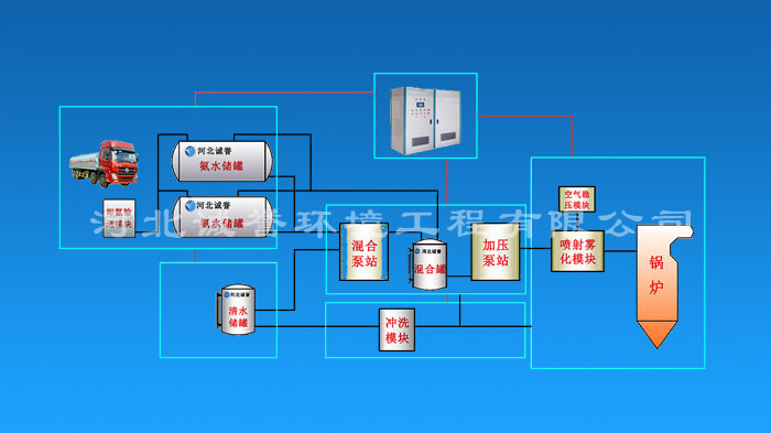 如此,即可確保氨水脫硝系統(tǒng)的安全性,才可使氨水最終順利進入噴射霧化模塊,由氨水脫硝噴槍噴出,對鍋爐煙氣進行脫硝處理。