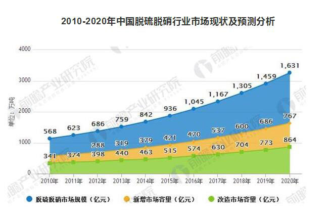 當(dāng)前,煙氣除塵、脫硫、脫硝是大氣污染治理的三大業(yè)務(wù)板塊,據(jù)前瞻產(chǎn)業(yè)研究院發(fā)布的《大氣污染治理行業(yè)市場(chǎng)前瞻與投資戰(zhàn)略規(guī)劃分析報(bào)告》統(tǒng)計(jì)數(shù)據(jù)顯示,2015年,我國(guó)脫硫脫硝行業(yè)需求規(guī)模超過(guò)900億元,其中新增市場(chǎng)容量超過(guò)400億元,改造市場(chǎng)容量超過(guò)500億元,且隨著國(guó)家大氣污染法規(guī)標(biāo)準(zhǔn)越來(lái)越嚴(yán)格,未來(lái)5-10年將是中國(guó)大氣污染治理的重點(diǎn)時(shí)期,市場(chǎng)容量將繼續(xù)保持在10%左右的增幅。