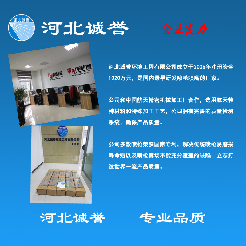 (2)增濕塔噴槍選用規(guī)范不銹鋼及耐磨合金,通過特殊加工工藝制成,具有耐酸、耐堿、耐高溫、耐磨損,使用壽命更長(zhǎng)等特點(diǎn)。其霧化角度從30-110度,流量從110kg/h到1600kg/h,可滿足各種規(guī)劃生產(chǎn)線的需求。