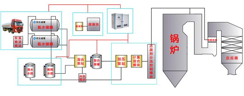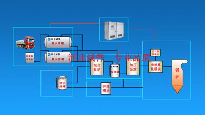 液體罐車運(yùn)送濃度20%-30%的氨水至水泥廠,泵送到儲(chǔ)存罐中供脫硝使用。脫硝時(shí),氨水經(jīng)泵站加壓稀釋后,通過管道輸送到脫硝噴槍的脫硝噴頭內(nèi),氨水溶液經(jīng)過脫硝噴頭霧化后直接噴入水泥窯尾分解爐內(nèi),氨氣與NOX反應(yīng)后生成氮?dú)庵苯优?.
